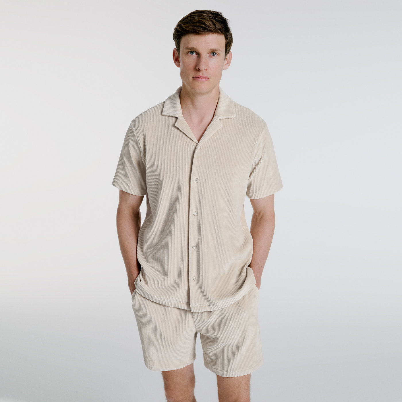 Marsel's cut and soft cotton velvet material offer an elegant look. You can wear this short-sleeved shirt over a plain white t-shirt or pair it with linen trousers for a stylish and functional summer look.