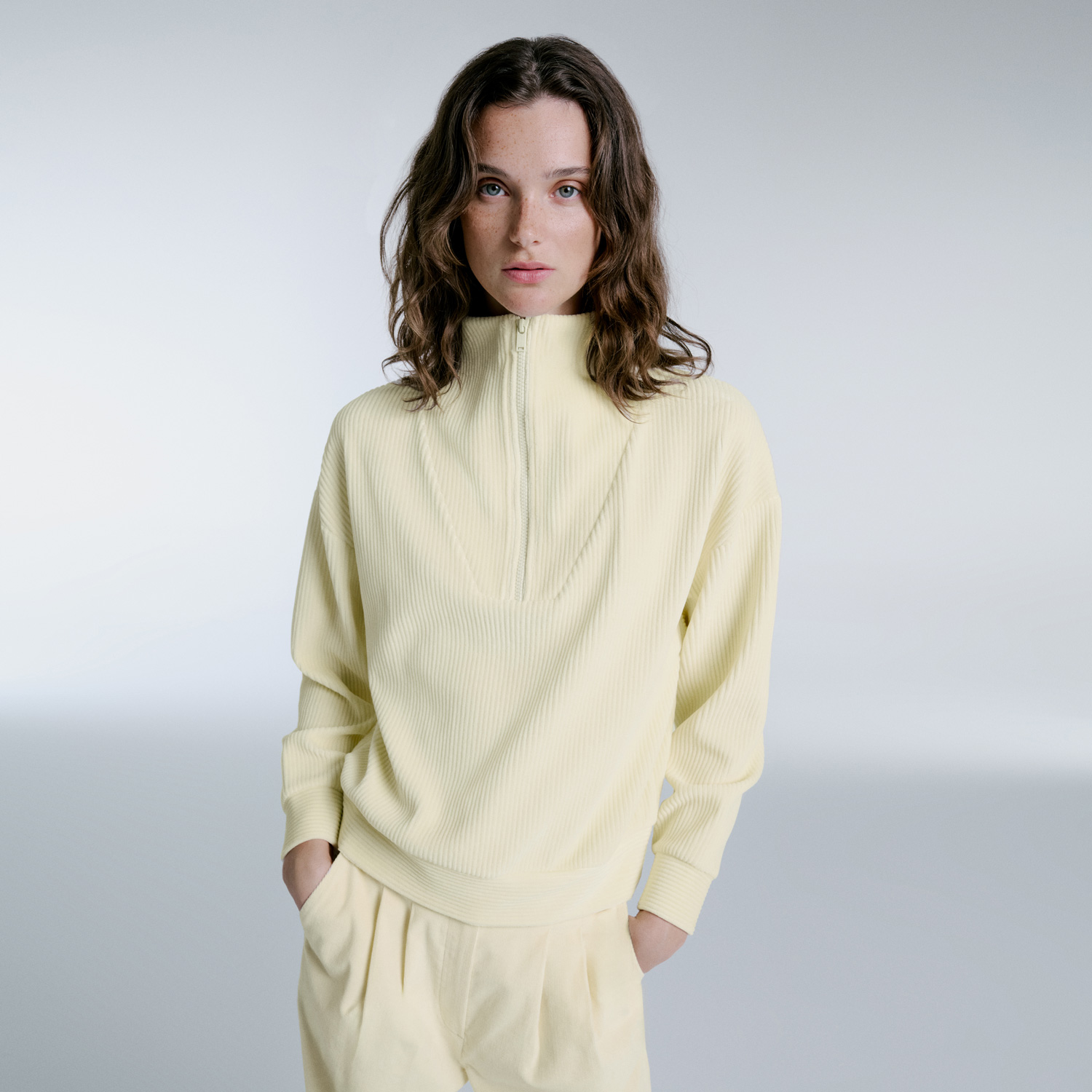 • Lya, with its ribbed corduroy texture, is a seasonal essential for transitional weather. Featuring a half-zip high collar, it offers effortless comfort and can be styled with denim or crew neck t-shirts for a smart-casual weekend look.